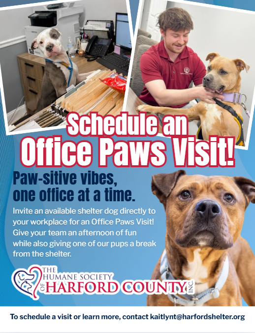 The Humane Society of Harford County is excited to bring one of our adoptable pups to any local businesses for a visit! It’s the perfect way to brighten your team’s day with a quick, feel-good break filled with puppy love, tail wags, and cuddles!