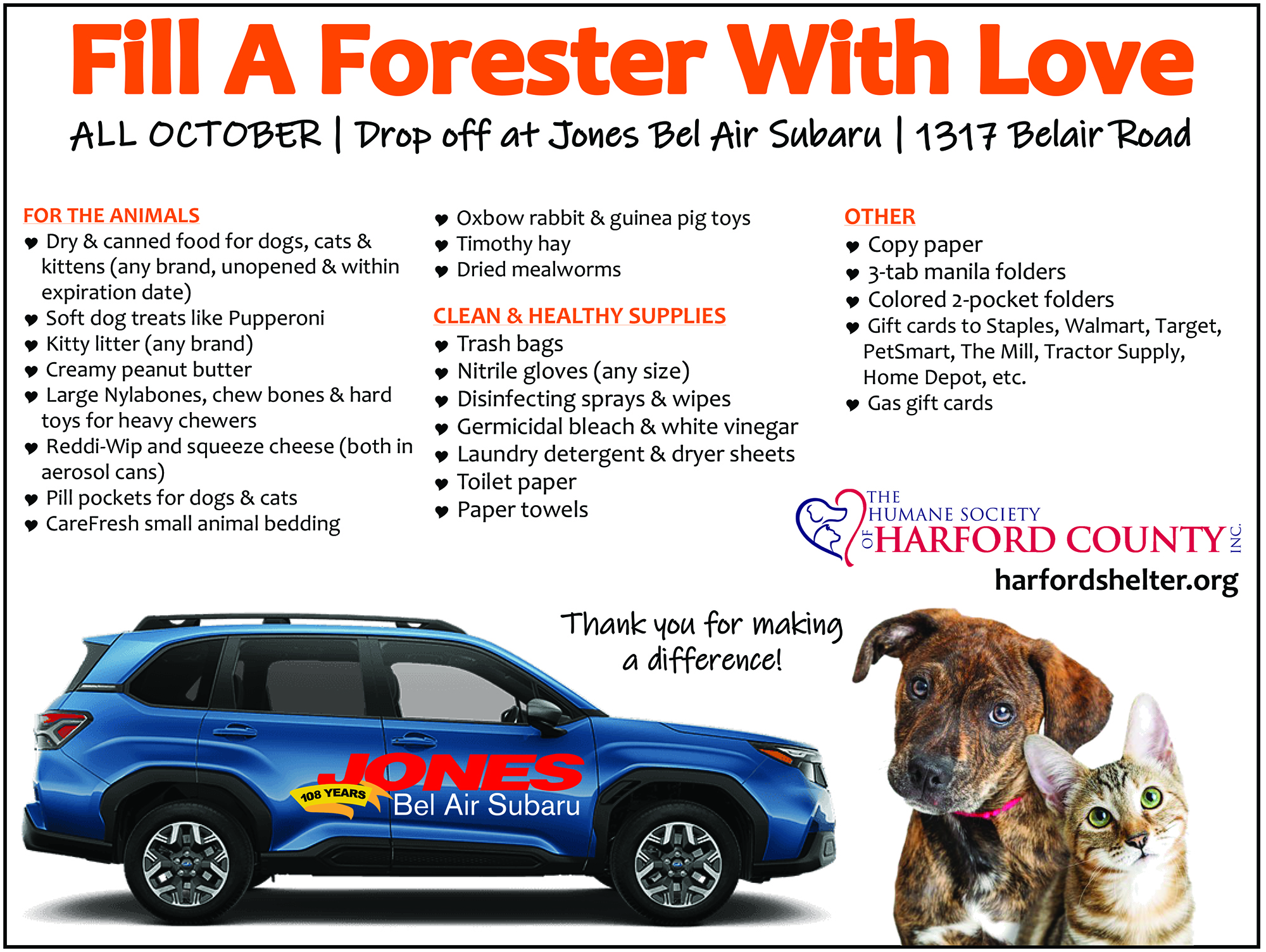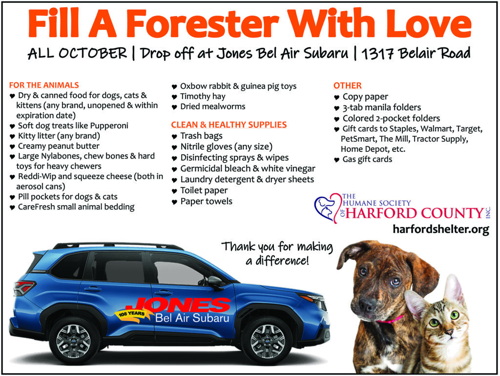 • Help Fill A Forester with pet supplies from our Wish List all month long. Bring donations to either Best Friends Fur Ever in Joppa at 1009 Philadelphia Road or Jones Bel Air Subaru at 1317 Bel Air Road.