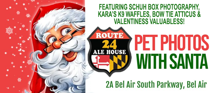 Bring your furry friends for Pet Photos with Santa on Saturday, November 29th from 11AM–2PM at Route 24 Ale House (2A Bel Air South Parkway, Bel Air).