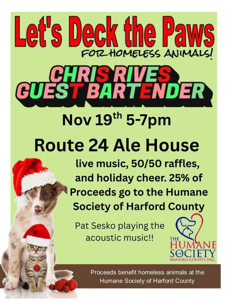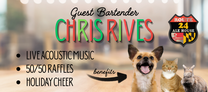 Join local celebrity, Chris Rives, at Route 24 Ale House on Wednesday, November 19th from 5-7pm. Chris will be behind the bar pouring drinks in support of homeless animals!