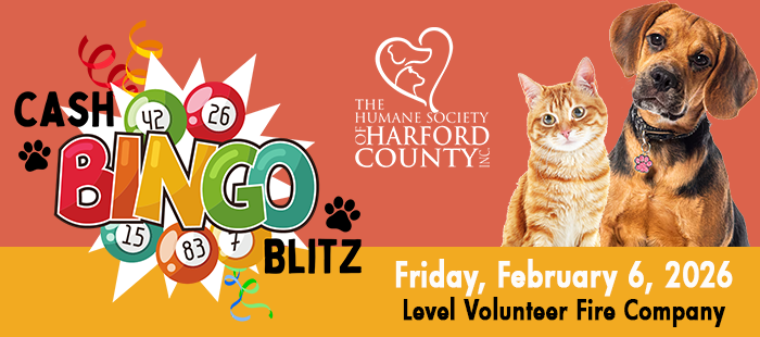 The Humane Society of Harford County is hosting its 3rd annual Cash Bingo fundraiser on Friday, February 6, 2026 at Level Volunteer Fire Company, 3633 Level Village Road in Havre de Grace. Doors open at 6pm and bingo starts at 7pm.