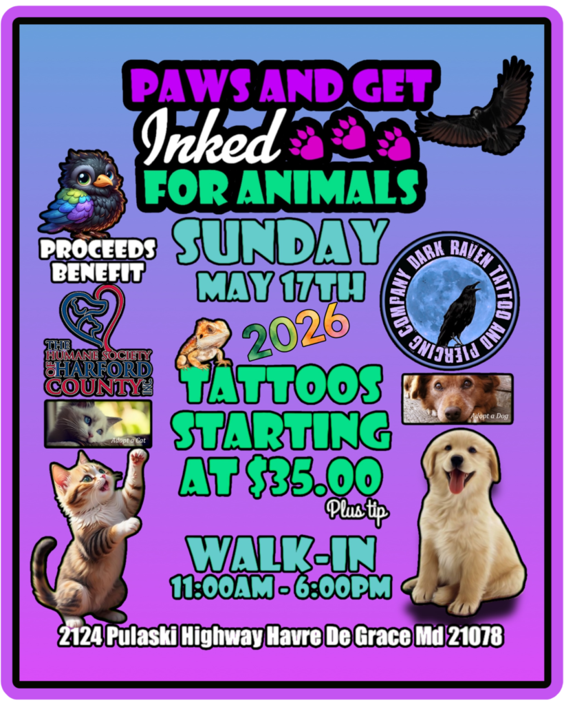 Join us at Dark Raven Tattoo & Piercing Company on Sunday, May 17th for a special walk-in tattoo event benefiting homeless pets at the Humane Society of Harford County!