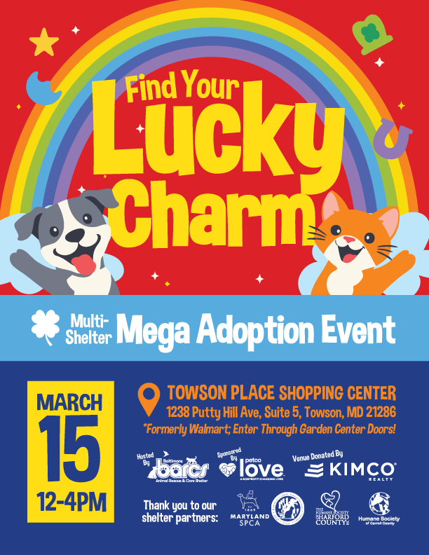 On Sunday, March 15 from 12–4 PM, the Baltimore Animal Rescue and Care Shelter (BARCS) will host “Find Your Lucky Charm,” a multi-shelter mega adoption event sponsored by Petco Love and held in a vacant storefront generously provided by Kimco Realty.