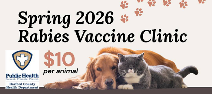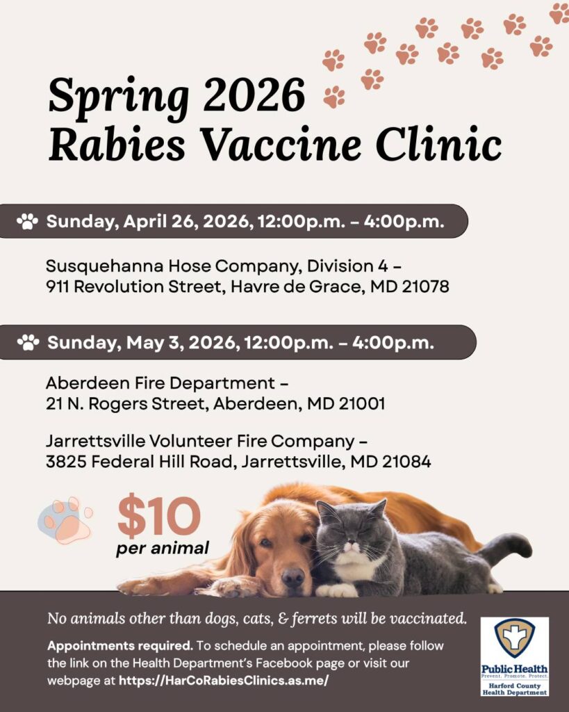 The Harford County Health Department is holding its annual Spring Rabies Vaccination Clinics for dogs, cats, and ferrets that are at least 3 months of age. The first clinic is on Sunday, April 26 from 12-4PM in Havre de Grace followed by two more on Sunday, May 3 from 12-4PM in Aberdeen and Jarrettsville. You must have an appointment for each animal you plan to have vaccinated! Schedule your appointment online now.
