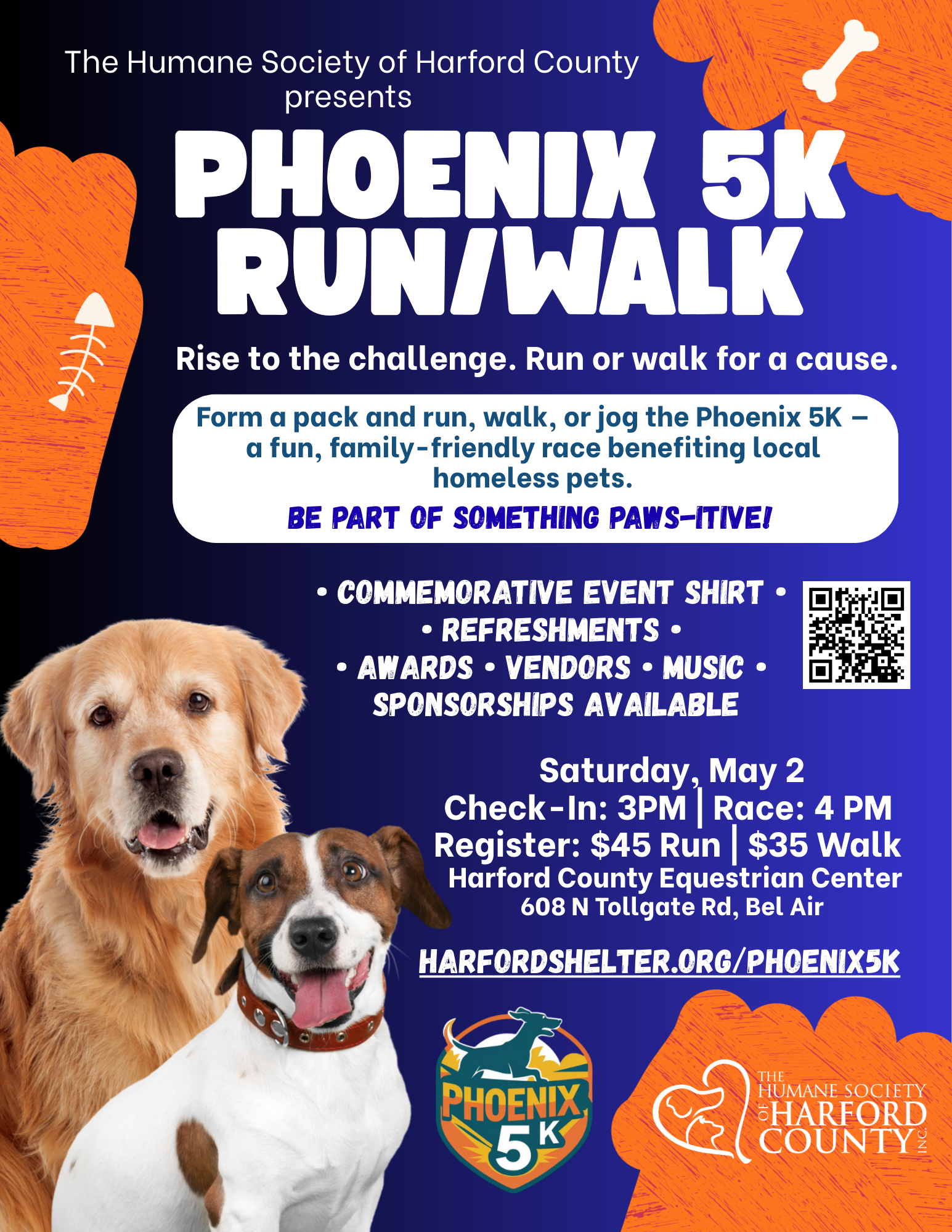 Join us for an inspiring afternoon on Saturday, May 4 of community, movement, and compassion at our Phoenix 5K Run and 1-Mile Walk/Run, both beginning at 4:00 PM. Runners, walkers, families, and four-legged friends of all abilities are welcome to participate. This event directly supports the lifesaving mission of the Humane Society of Harford County, helping provide care, shelter, medical treatment, and second chances for animals in our community. Every step taken and every dollar raised helps animals on their journey from hardship to hope—just like the Phoenix rising.